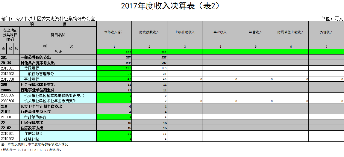 2017年度本年收入合计267万元。其中:财政拨款收入267万元,占本年收入100%;上级补助收入0万元,占本年收入0%;事业收入0万元,占本年收入0%;经营收入0万元,占本年收入0%;附属单位上缴收入0万元,占本年收入0%;其他收入0万元,占本年收入0%。