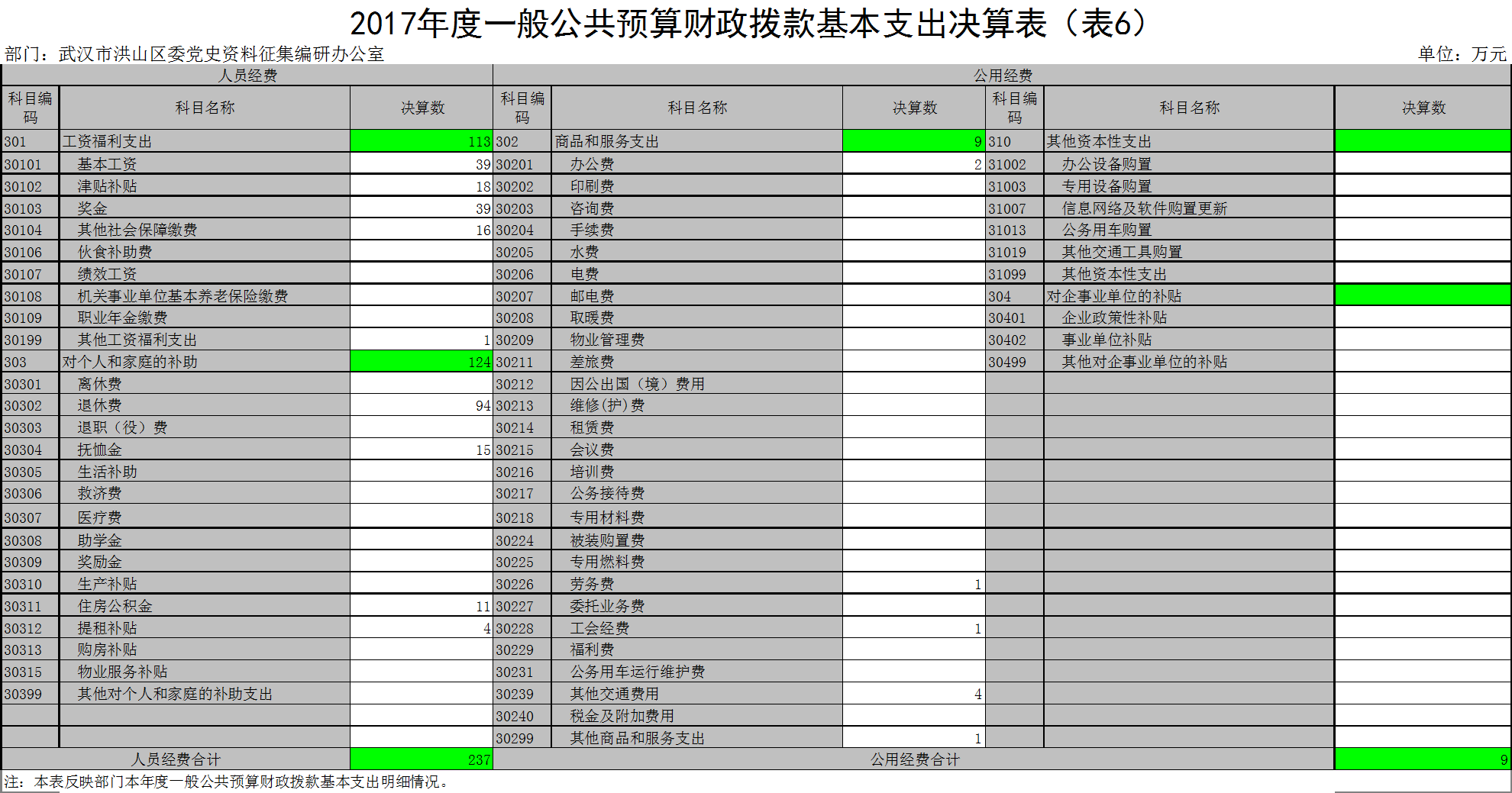 2017度一般公共预算财政拨款基本支出246万元,其中,人员经费237万元,主要包括:基本工资、津贴补贴、奖金、其他社会保障缴费、伙食补助费、绩效工资、机关事业单位基本养老保险缴费、职业年金缴费、其他工资福利支出、离休费、退休费、退职(役)费、抚恤金、生活补助、救济费、医疗费、助学金、奖励金、生产补贴、住房公积金、提租补贴、购房补贴、物业服务补贴、其他对个人和家庭的补助支出;公用经费9万元,主要包括:办公费、印刷费、咨询费、手续费、水费、电费、邮电费、取暖费、物业管理费、差旅费、因公出国(境)费、维修(护)费、 租赁费、会议费、培训费、公务接待费、专用材料费、被装购置费、专用燃料费、劳务费、委托业务费、工会经费、福利费、公务用车运行维护费、其他交通费用、税金及附加费用、其他商品和服务支出、办公设备购置、专用设备购置、信息网络及软件购置更新、公务用车购置、其他交通工具购置、其他资本性支出、企业政策 性补贴、事业单位补贴、其他对企事业单位的补贴。