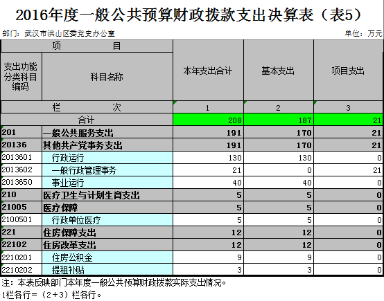 2016年一般公共预算财政拨款支出年度预算为218万元(包括年初部门预算、基本建设等专项资金、上级下达的专项转移支付资金及年初结转和结余资金等),支出决算为208万元,完成年度预算的95%。其中:基本支出187万元,项目支出21万元。项目支出主要用于《洪山年鉴》编辑、印刷8万元;《中共洪山历史》(1979-2002)征求意见、修改、专家审议、二稿1万元;党建工作经费(含纪检)2万元;党史宣传教育1万元;文献资料数据库收集、整理、建档5万元;文明创建工作4万元。