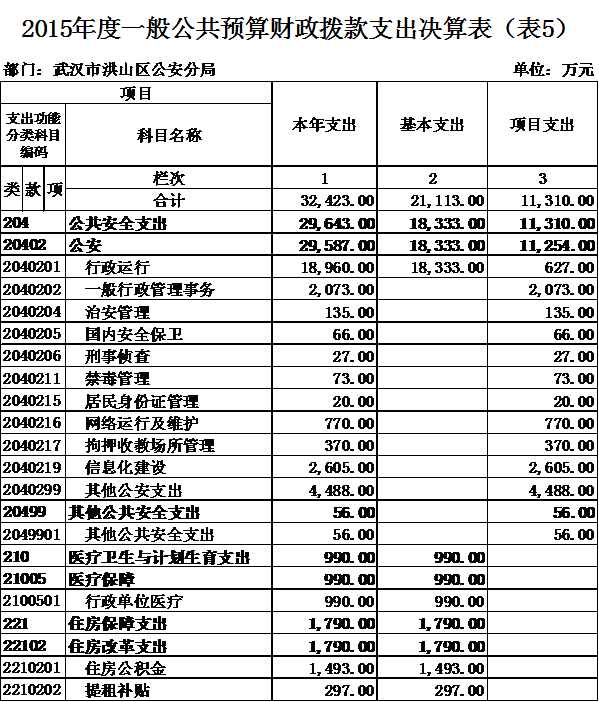2015年一般公共预算财政拨款支出年度预算为22209万元(包括年初部门预算、基本建设等专项资金、上级下达的专项转移支付资金及年初结转和结余资金等支出),支出决算为32423万元,完成年度预算的145.99%。其中:基本支出21113万元,项目支出11310万元。项目支出主要用于行政运行627万元,主要成效是基层设施建设和信息网络及软件购置更新;一般行政管理事务2073万元,主要成效是购买装备、后勤保障、民警教育培训;治安管理135万元,主要成效是保障了110接处警;国内安全保卫66万元,主要成效是保障维稳处突工作;刑事侦查27万元,主要成效是保障办案打击犯罪;禁毒管理73万元,主要成效是社区戒毒和康复及打击毒品犯罪;居民身份证管理20万元,主要成效是对贫困群众办理身份证的减免及身份证的工本费;网络运行及维护770万元,主要成效是公安专网维护;拘押收押场所管理370万元,主要成效是保障了看守所关押人员的伙食费、医疗费、水电费、场所修缮费支出;信息化建设2605万元,主要成效是城市视频监控维护、大情报、金盾工程配套建设;其他公安支出4488万元,主要成效是社区群防工作、消防专项、社区警务室维护消耗、辅警文员保安费用、嫌疑人救治体检、司法救助、特警专项、武警专项、司法调解、文明创建、全局物业化管理;其他公共安全支出56万元,主要成效是大型修缮。