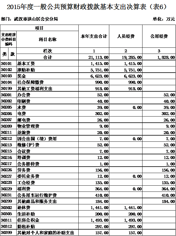 2015度一般公共预算财政拨款基本支出21113万元,其中,人员经费19285万元,主要包括:基本工资、津贴补贴、奖金、社会保障缴费、绩效工资、其他工资福利支出、离休费、退休费、抚恤金、退职(役)费、抚恤金、生活补助、医疗费、奖励金、住房公积金、提租补贴、其他对个人和家庭的补助支出;公用经费1828万元,主要包括:办公费、印刷费、咨询费、手续费、水费、电费、邮电费、取暖费、物业管理费、差旅费、因公出国(境)费、维修(护)费、租赁费、会议费、培训费、公务接待费、专用材料费、被装购置费、专用燃料费、劳务费、委托业务费、工会经费、福利费、公务用车运行维护费、其他交通费用、税金及附加费用、其他商品和服务支出;基本建设和其他资本性支出5780万元,主要包括:房屋建筑构建费、办公设备购置、专用设备购置、基础设施建设、大型修缮、信息网络及软件购置更新、公务用车购置、其他交通工具购置、其他基本建设和资本性支出。