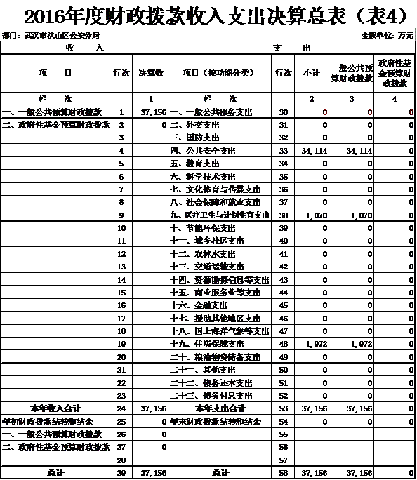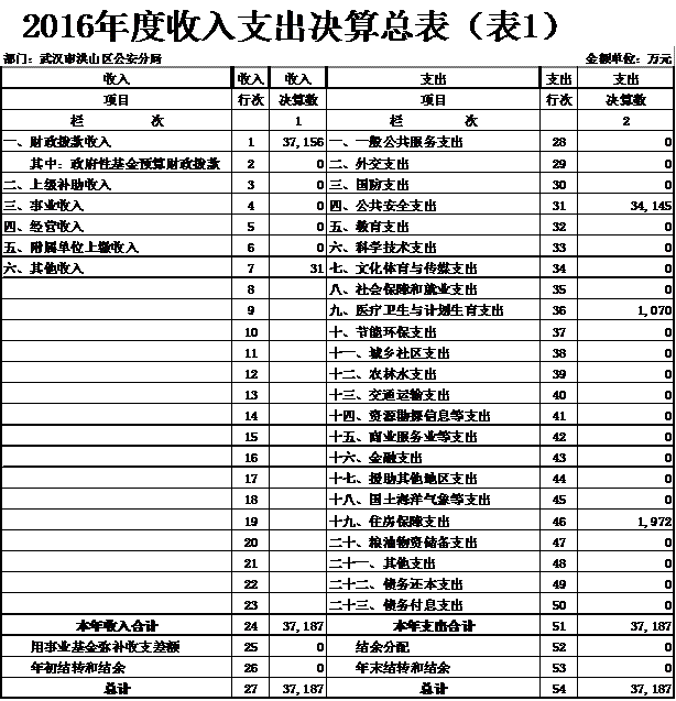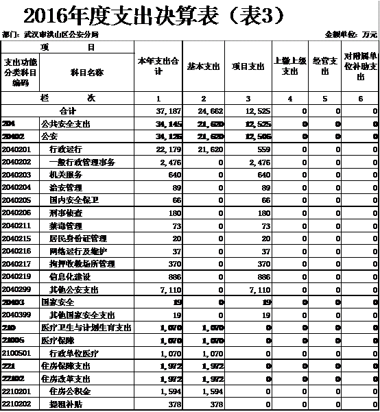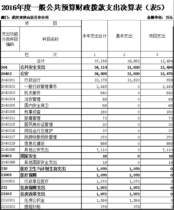 2016年一般公共预算财政拨款支出年度预算为24956万元(包括年初部门预算、基本建设等专项资金、上级下达的专项转移支付资金及年初结转和结余资金等支出),支出决算为37156万元,完成年度预算的148.89%。其中:基本支出24662万元,项目支出12494万元。项目支出主要用于行政运行559万元,主要成效是基层设施建设和信息网络及软件购置更新;一般行政管理事务2445万元,主要成效是购买装备、民警教育培训;机关服务640万元,主要成效是后勤保障;治安管理89万元,主要成效是保障了110接处警;国内安全保卫66万元,主要成效是保障维稳处突工作;刑事侦查180万元,主要成效是保障办案打击犯罪;禁毒管理73万元,主要成效是社区戒毒和康复及打击毒品犯罪;居民身份证管理20万元,主要成效是对贫困群众办理身份证的减免及身份证的工本费;网络运行及维护37万元,主要成效是公安专网维护;拘押收押场所管理370万元,主要成效是保障了看守所关押人员的伙食费、医疗费、水电费、场所修缮费支出;信息化建设885万元,主要成效是城市视频监控维护、大情报、金盾工程配套建设;其他公安支出7110万元,主要成效是社区群防工作、消防专项、社区警务室维护消耗、辅警文员保安费用、嫌疑人救治体检、司法救助、特警专项、武警专项、司法调解、文明创建、全局物业化管理;其他公共安全支出19万元,主要成效是珞南所业务用房咨询设计勘察费。