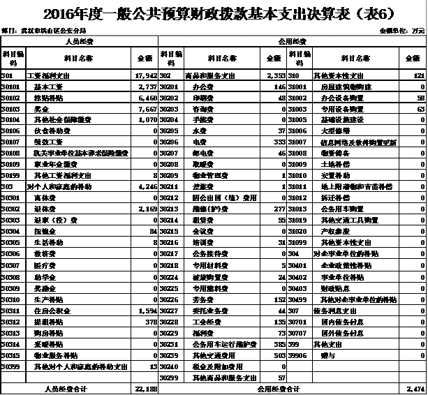 2016度一般公共预算财政拨款基本支出24662万元,其中,人员经费22188万元,主要包括:基本工资、津贴补贴、奖金、社会保障缴费、绩效工资、其他工资福利支出、离休费、退休费、抚恤金、退职(役)费、抚恤金、生活补助、医疗费、奖励金、住房公积金、提租补贴、其他对个人和家庭的补助支出;公用经费2474万元,主要包括:办公费、印刷费、水费、电费、邮电费、物业管理费、差旅费、维修(护)费、租赁费、培训费、公务接待费、被装购置费、专用燃料费、劳务费、委托业务费、工会经费、福利费、公务用车运行维护费、其他交通费用、其他商品和服务支出、办公设备购置、专用设备购置。