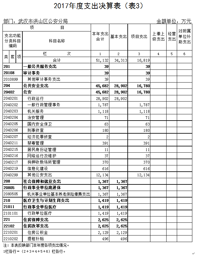 2017年度本年支出合计51132万元。其中:基本支出34313万元,占本年支出67.11%,项目支出16819万元,占本年支出32.89%。