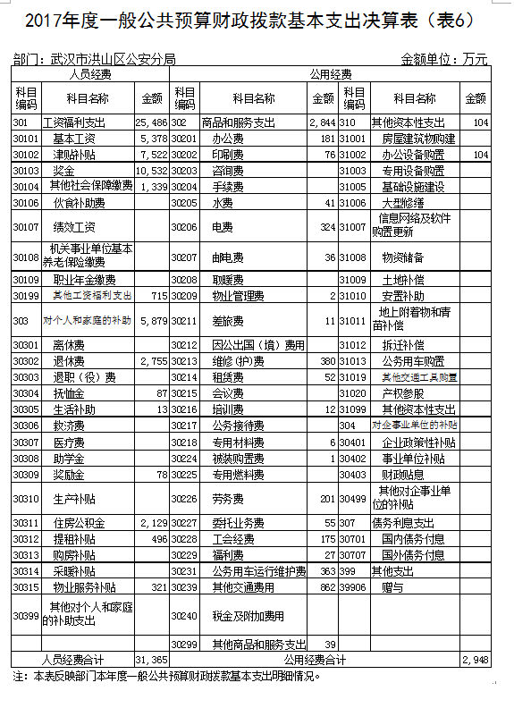 2017度一般公共预算财政拨款基本支出34313万元,其中,人员经费31365万元,主要包括:基本工资、津贴补贴、奖金、其他社会保障缴费、伙食补助费、绩效工资、机关事业单位基本养老保险缴费、职业年金缴费、其他工资福利支出、离休费、退休费、退职(役)费、抚恤金、生活补助、救济费、医疗费、助学金、奖励金、生产补贴、住房公积金、提租补贴、购房补贴、物业服务补贴、其他对个人和家庭的补助支出;公用经费2948万元,主要包括:办公费、印刷费、咨询费、手续费、水费、电费、邮电费、取暖费、物业管理费、差旅费、因公出国(境)费、维修(护)费、租赁费、会议费、培训费、公务接待费、专用材料费、被装购置费、专用燃料费、劳务费、委托业务费、工会经费、福利费、公务用车运行维护费、其他交通费用、税金及附加费用、其他商品和服务支出、办公设备购置、专用设备购置、信息网络及软件购置更新、公务用车购置、其他交通工具购置、其他资本性支出、企业政策性补贴、事业单位补贴、其他对企事业单位的补贴。