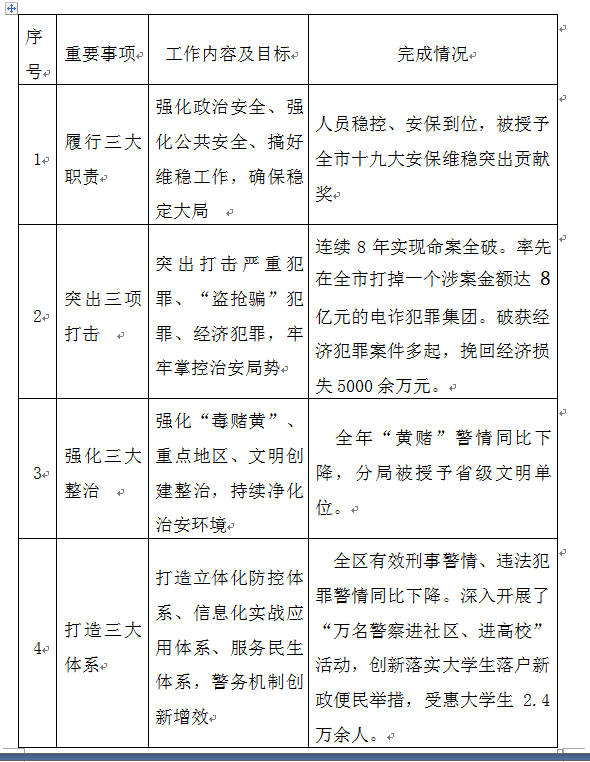 一是突出打击严重犯罪。连续8年实现命案全破。二是突出打击“盗抢骗”犯罪。率先在全市打掉一个涉案金额达8亿元的电诈犯罪集团。三是突出打击经济犯罪。创新所队联合作战工作机制,破获经济犯罪案件多起,挽回经济损失5000余万元。