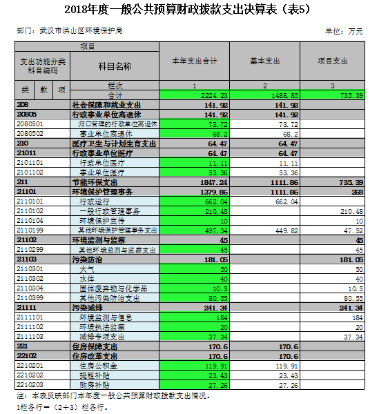 2018年度财政拨款支出2,224.23万元,主要用于以下方面:一般公共服务(类)支出0万元,占0%;国防支出0万元,占0%;公共安全支出0万元,占0%;教育支出0万元,占0%;科学技术支出0万元,占0%;文化体育与传媒支出0万元,占0%;社会保障和就业支出141.92万元,占6.38%;医疗卫生与计划生育支出64.47万元,占2.90%;节能环保支出1,847.24万元,占83.05%;城乡社区支出0万元,占0%;农林水支出0万元,占0%;交通运输支出0万元,占0%;资源勘探信息等支出0万元,占0%;商业服务业等支出0万元,占0%;援助其他地区支出0万元,占0%;国土海洋气象等支出0万元,占0%;住房保障支出170.60万元,占7.67%;粮油物资储备支出0万元,占0%;其他支出0万元,占0%;债务付息支出0万元,占0%。