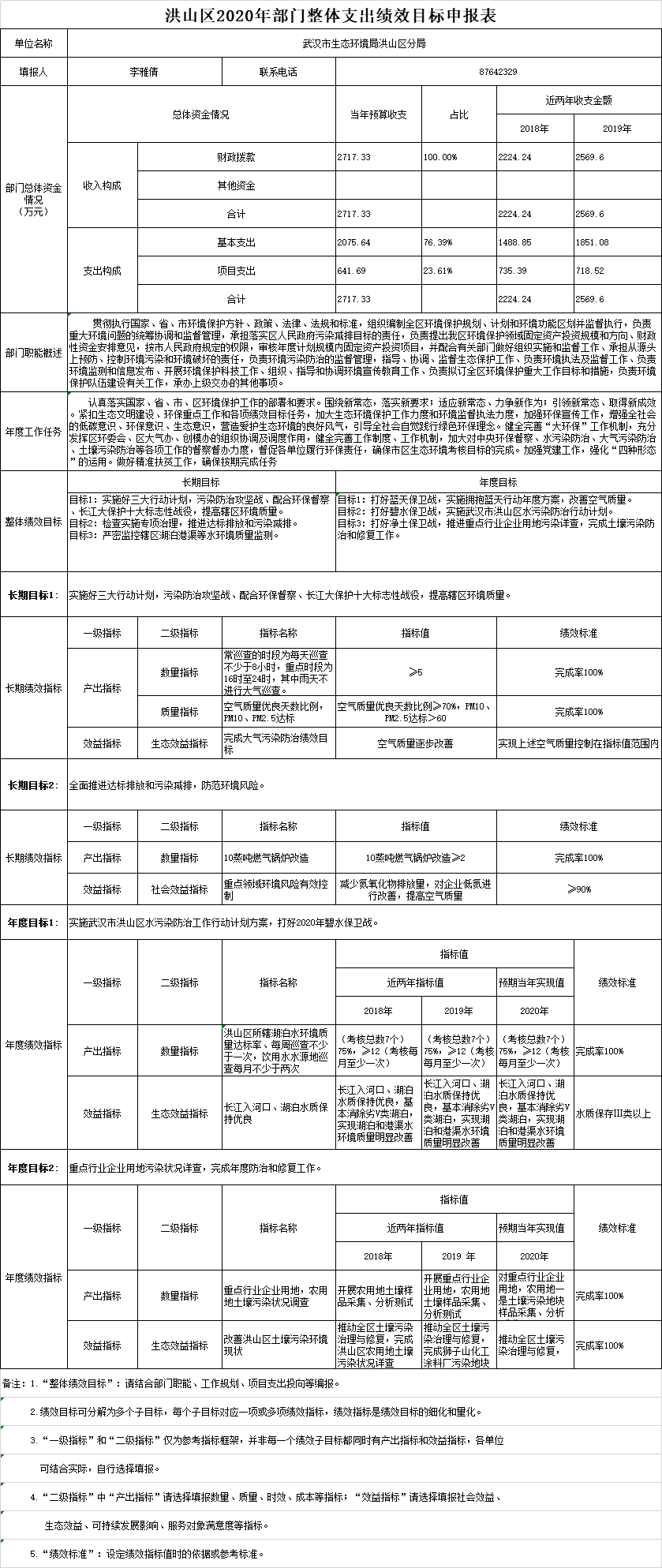 名 称:武汉市生态环境局黄色网址 分局2020年部门整体支出绩效目标申报表