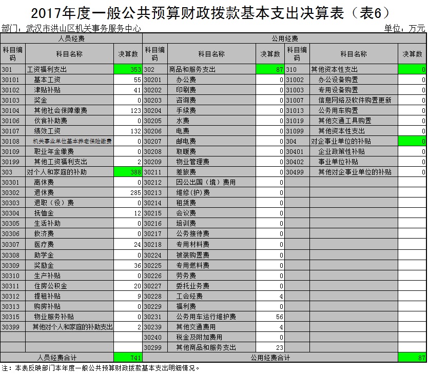 2017度一般公共预算财政拨款基本支出828万元,其中,人员经费741万元,主要包括:基本工资、津贴补贴、奖金、其他社会保障缴费、伙食补助费、绩效工资、机关事业单位基本养老保险缴费、职业年金缴费、其他工资福利支出、离休费、退休费、退职(役)费、抚恤金、生活补助、救济费、医疗费、助学金、奖励金、生产补贴、住房公积金、提租补贴、购房补贴、物业服务补贴、其他对个人和家庭的补助支出;公用经费87万元,主要包括:办公费、印刷费、咨询费、手续费、水费、电费、邮电费、取暖费、物业管理费、差旅费、因公出国(境)费、维修(护)费、 租赁费、会议费、培训费、公务接待费、专用材料费、被装购置费、专用燃料费、劳务费、委托业务费、工会经费、福利费、公务用车运行维护费、其他交通费用、 税金及附加费用、其他商品和服务支出、办公设备购置、专用设备购置、信息网络及软件购置更新、公务用车购置、其他交通工具购置、其他资本性支出、企业政策性补贴、事业单位补贴、其他对企事业单位的补贴。