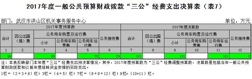2017年度“三公”经费财政拨款年度预算数为99万元,支出决算为101万元,为预算的102%,其中: