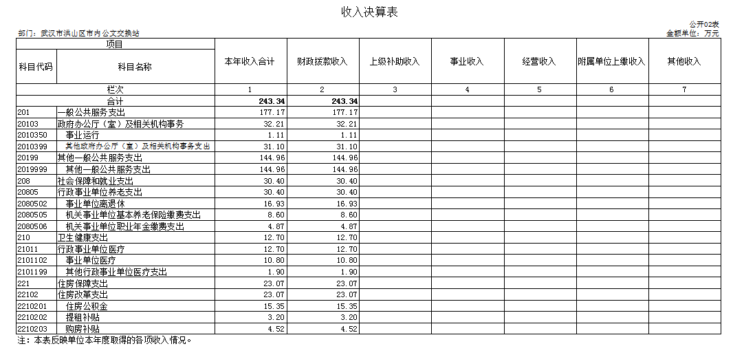 2022年度收入合计243.34万元,与2021年度相比,收入合计5.27减少万元,下降2.1%。其中:财政拨款收入243.34万元,占本年收入100%;本年度无上级补助收入、事业收入、经营收入、附属单位上缴收入、其他收入。