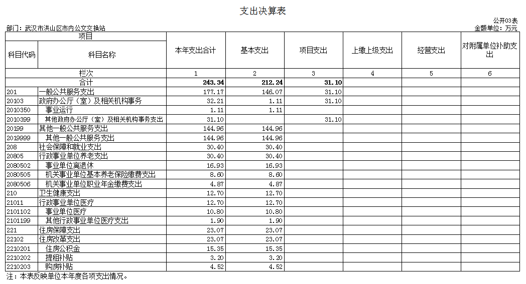 2022年度支出合计243.34万元,与2021年度相比,支出合计减少5.27万元,下降2.1%。其中:基本支出212.24万元,占本年支出87.22%;项目支出31.10万元,占本年支出12.78%;本年度无上缴上级支出、经营支出、对附属单位补助支出。