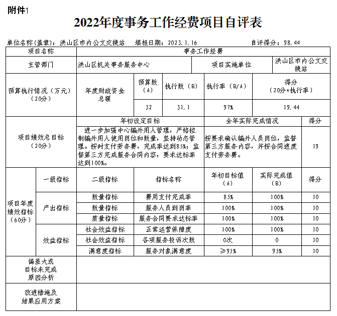 1、事务工作经费项目绩效自评综述:项目全年预算数为32万元,执行数为31.10万元,完成预算的97%。主要产出和效益是:通过责任到人、措施到位,确保了“人员、文件、车辆”安全,全年服务400多家单位,共传递公文15多万件,无一丢失、延误、泄密,保证了政令的上传下达畅通。