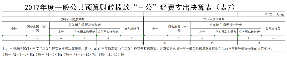 2017年度三公经费财政拨款年度预算数为4万元,支出决算为29万元,为预算的725%,其中: