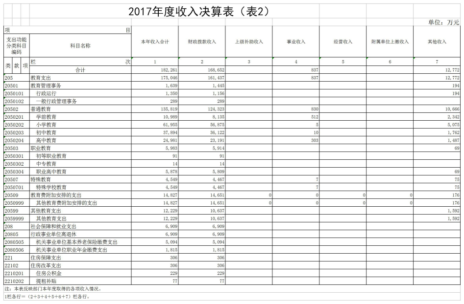 2017年度本年收入合计182,261万元。其中:财政拨款收入168,652万元,占本年收入92.53%;上级补助收入0万元,占本年收入0.00%;事业收入837万元,占本年收入0.46%;经营收入0万元,占本年收入0.00%;附属单位上缴收入0万元,占本年收入0.00%;其他收入12,772万元,占本年收入7.01%。