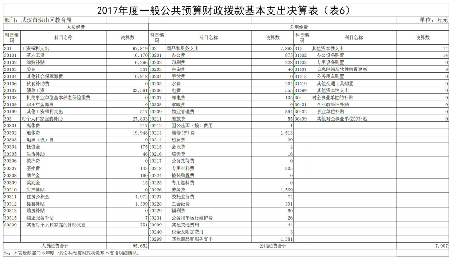 2017年度财政拨款收、支总计168,652万元。与2016年相比,财政拨款收、支总计各增加37,414万元,增长28.51%。主要原因是新建学校洪山一小、洪山二小、华中师范大学附属保利南湖小学、英格一分校正式投入使用;另新招聘人事代理教师319人。