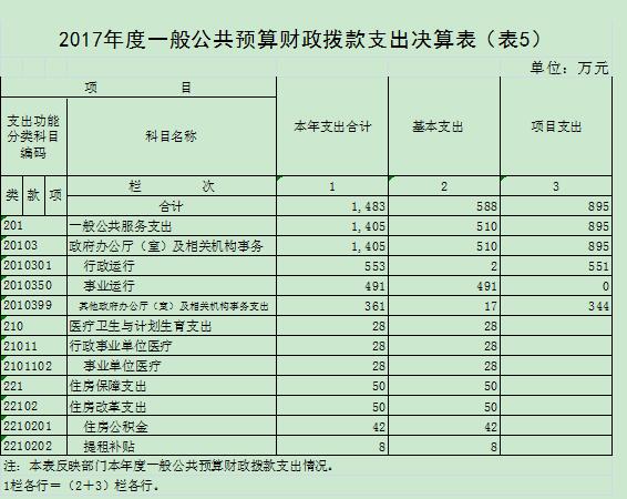 2017年度财政拨款支出1,483万元,主要用于以下方面:一般公共服务(类)支出1,405万元,占95 %;医疗卫生与计划生育支出28万元,占2%;住房保障支出50万元,占3%