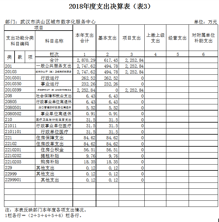 出617.45万元,占本年支出21.51%;项目支出2252.84万元,占本年支出78.49%;上缴上级支出0万元,占本年支出0%;经营支出0万元,占本年支出0%;对附属单位补助支出 0万元,占本年支出0%。