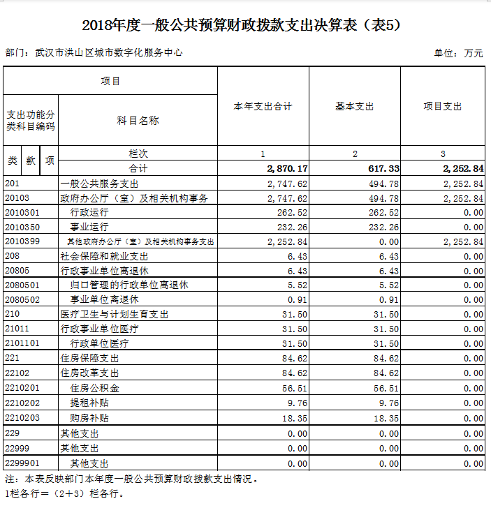 2018年一般公共预算财政拨款支出年初预算为2897.64万元(包括年初部门预算、基本建设等专项资金、上级下达的专项转移支付资金及年初结转和结余资金等),支出决算为2870.17万元,完成年初预算的99.05%。其中:基本支出617.33万元,项目支出2252.84万元。项目支出主要用于电子政务全国产化试点项目(二期)900万元,以推动全国产自主可控信息产业的持续发展,在政务专网建设符合国家电子公文规范的应用系统,以实现无纸化办公。接警平台人员经费及平台系统运维费217.30万元,以保障全区城市综合管理监督指挥系统正常运转和24小时值班人员的工资福利支出。区机关办公区域无线网络升级改造项目68.54万元,为机关工作人员和办事群众提供办公、会议、市民办事等安全、稳定、便捷、高效的公益无线网络接入服务。区级政务网络运维项目42万元,做好全区电子政务网络的保障工作,提高社区接入点故障处置响应速度,提高应急处理能力,确保全年无重大网络安全事故发生。网上群众工作部综合管理平台198.1万元,分别用于支付云平台开发的预付款40万元和云平台服务器设备货款158.1万元,以为后期建立统一的网上群众工作服务平台,同时实现我区“五网合一”的多网格融合管理而服务。委办局、街乡、社区政务网运维项目48.8万元,确保了全区政务网络整体基础安全和入网单位互连通信线路、相关设备的稳定运行。政务网全覆盖升级提速项目549.5万元,此项是为加快实现全区政务网络全覆盖和提速升级,提高行政效率、增强政府及各部门管理手段和公共服务能力,推动政府信息化进程。