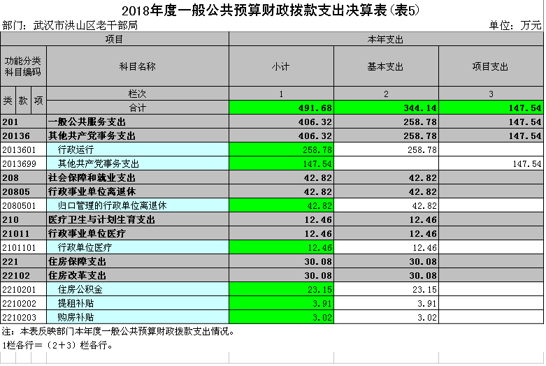 2018年一般公共预算财政拨款支出年初预算为541万元(包括年初部门预算、基本建设等专项资金、上级下达的专项转移支付资金及年初结转和结余资金等),支出决算为491.68万元,完成年初预算的90.88%。其中:基本支出344.14万元,项目支出147.54万元。项目支出主要用于文明创建工作经费 1万元,用于各类文明创建活动支出;“四就近”工作经费3万元,用于对老干部比较集中的社区改善食堂、活动室、学习室等硬件条件;全区老干部党支部书记学习班0.97万元,用于组织全区各单位老干部党支部书记培训;老干部活动中心运行经费6万元,用于老干部活动中心的正常运行和组织老干部开展相关活动;老干部市内参观考察0.98万元,用于上下半年各组织1次区级离退休干部参观考察;后勤保障经费9.24万元,用于食堂等后勤保障;购买社会服务16万元,用于老干部艺术团和老年书画社开展活动;购买劳务支出12.53万元,用于购买律师、会计服务及食堂工人服务;党建工作经费(含纪检)1万元,用于党建、纪检专项工作;帮扶资金(老干部遗属特殊困难专项救助资金)4万元,用于帮助解决7名离退休干部及遗属特殊困难;物业管理费57万元,用于保障老干部局大楼正常工作运行;重阳节活动(大型)1万元,用于组织全区离退休干部重阳节慰问活动;走访看望慰问老干部经费11.97万元 ,用于重阳节、春节期间对老干部进行慰问;全区老干部工作经费9万元,用于全局日常办公。