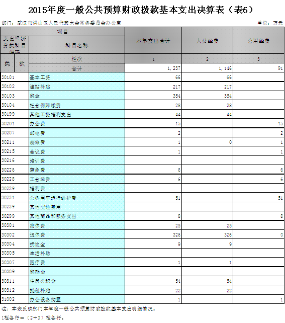 2015度一般公共预算财政拨款基本支出1,237万元,其中,人员经费1,146万元,主要包括:基本工资、津贴补贴、奖金、社会保障缴费、绩效工资、其他工资福利支出、离休费、退休费、抚恤金、退职(役)费、抚恤金、生活补助、救济费、医疗费、助学金、奖励金、生产补贴、住房公积金、提租补贴、购房补贴、其他对个人和家庭的补助支出;公用经费91万元,主要包括:办公费、印刷费、咨询费、手续费、水费、电费、邮电费、取暖费、物业管理费、差旅费、因公出国(境)费、维修(护)费、租赁费、会议费、培训费、公务接待费、专用材料费、被装购置费、专用燃料费、劳务费、委托业务费、工会经费、福利费、公务用车运行维护费、其他交通费用、税金及附加费用、其他商品和服务支出;基本建设和其他资本性支出2万元,主要包括:房屋建筑构建费、办公设备购置、专用设备购置、基础设施建设、大型修缮、信息网络及软件购置更新、物资储备、土地补偿、安置补助、地上附着物和青苗补助、拆迁补偿、公务用车购置、其他交通工具购置、其他基本建设和资本性支出;对企事业单位的补贴万元,主要包括:企业政策性补贴、事业单位补贴、财政贴息、其他对企事业单位的补贴;债务利息和其他支出万元,主要包括:国内债务付息、国外债务付息、赠与。