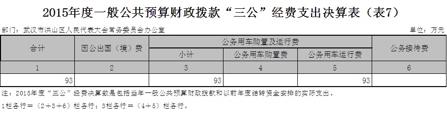 2015年度“三公”经费财政拨款年度预算为 94 万元,支出决算为93万元,完成预算的 99 %。其中: