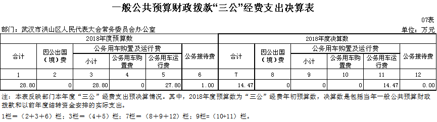 2018度“三公”经费财政拨款年初预算数为28.8万元,支出决算为14.47万元,为预算的50.24%,其中: