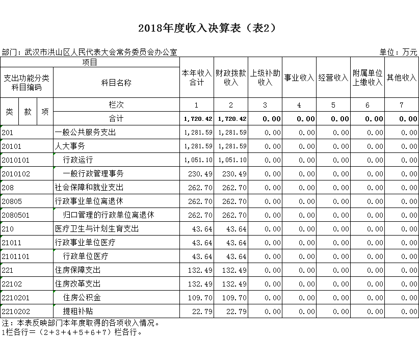 2018年度本年收入合计1,720.42万元。其中:财政拨款收入1,720.42万元,占本年收入100%;上级补助收入0 万元,占本年收入0%;事业收入0万元,占本年收入0%;经营收入0万元,占本年收入0%;附属单位上缴收入0万元,占本年收入0%;其他收入0万元,占本年收入0%。