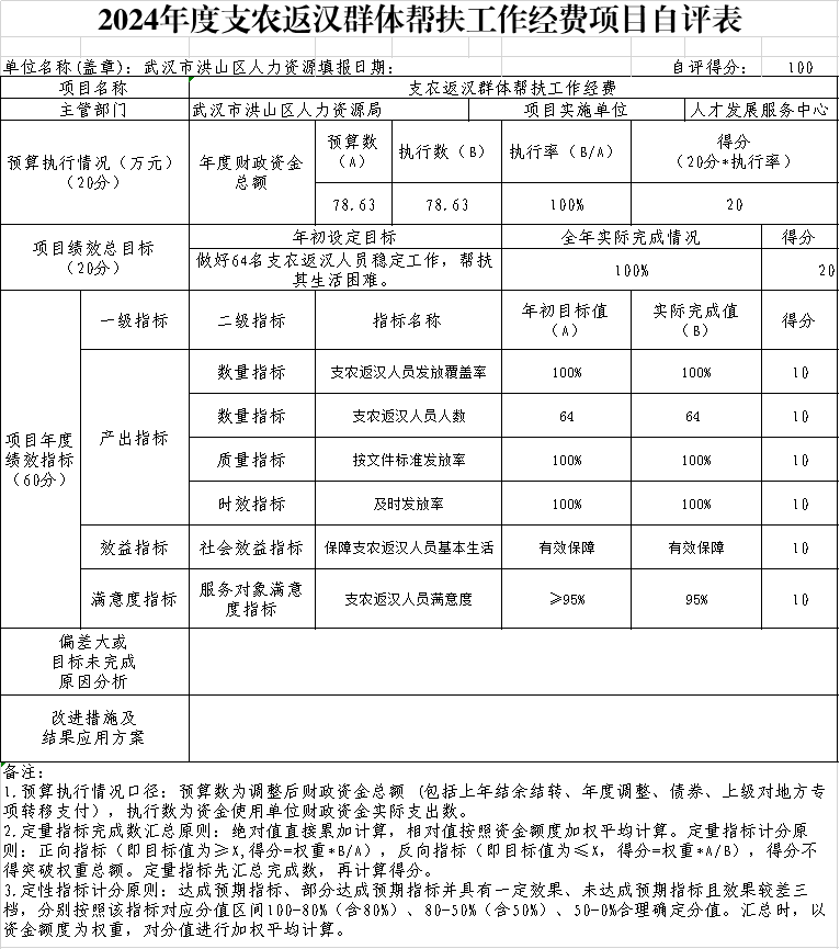 主要产出和效益:做好64名支农返汉人员稳定工作,帮扶其生活困难。