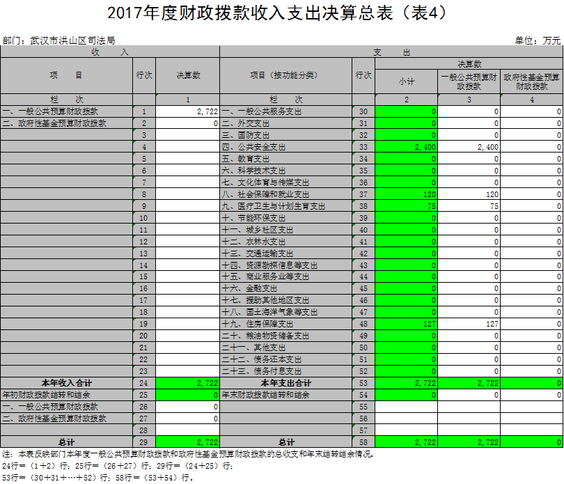 2017年度收、支总计2,722万元。与2016年相比,收、支总计各增加403.12万元,增长18%,主要原因是行政运行增加人员及增加政法工作津贴,项目经费增加视频会议室等。
