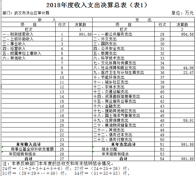 2018年度收、支总计981.89万元,与2017年相比,财政拨款收、支总计各增加144.89万元,增长14.76%。主要原因是审计任务增加,相关工作经费增加。