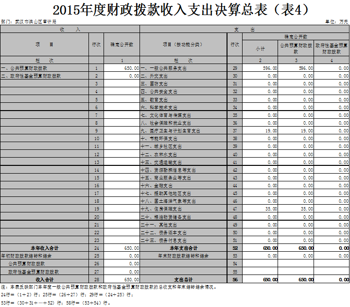 2015年度财政拨款收支总计 650 万元。与2014年相比,财政拨款收、支总计各增加83万元,增长14.64%,主要原因是审计任务增加相关工作经费增加。