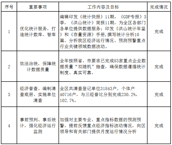 统计管理 项目绩效自评综述:该项目包括四上企业工作经费、统计协理员管理、区级统计工作保障经费、基层统计员管理,执行数 259.63 万元,为加强全市基层统计力量,夯实基层统计工作基础,提高统计工作科学化水平,引导和鼓励更多的优秀大学毕业生留汉就业,投身统计事业,为统计工作更好地服务全市经济社会发展提供人才保障和智力支持,按照市委、市政府要求,结合“百万大学生留汉创业就业工程”, “百万大学生留汉创业就业工程”,我区招聘了大批基层统计员及统计协理员,充分保障了基层统计站点的建设和维护。通过四上企业工作经费对全区规模以上工业、建筑业、商业和服务业单位填报报表给予每月100元补助,以解决数据资料收集中的及时性等问题。统计工作信息化管理:为拓宽数据发布渠道,方便数据使用者及时查阅我区统计数据,提高统计服务质量和水平,开发维护数据洪山统计数据库。