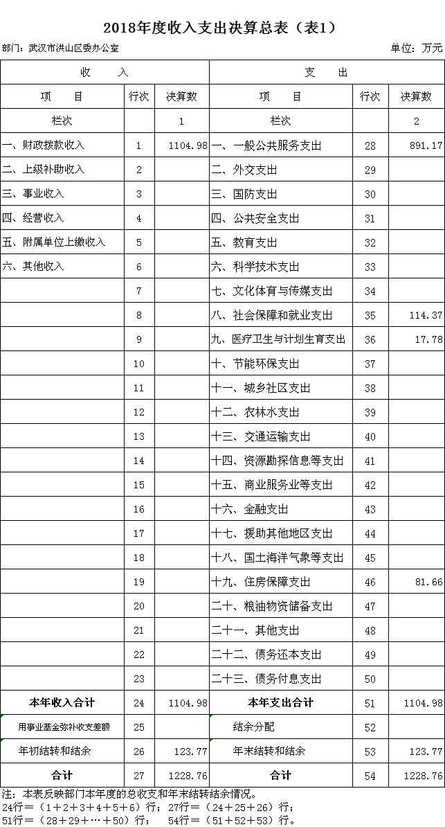 2018年度收、支总计 1228.76 万元。与2017年相比,收、支总计各增加 26.76 万元,增长 2 %,主要原因是人员变动,薪酬调整。