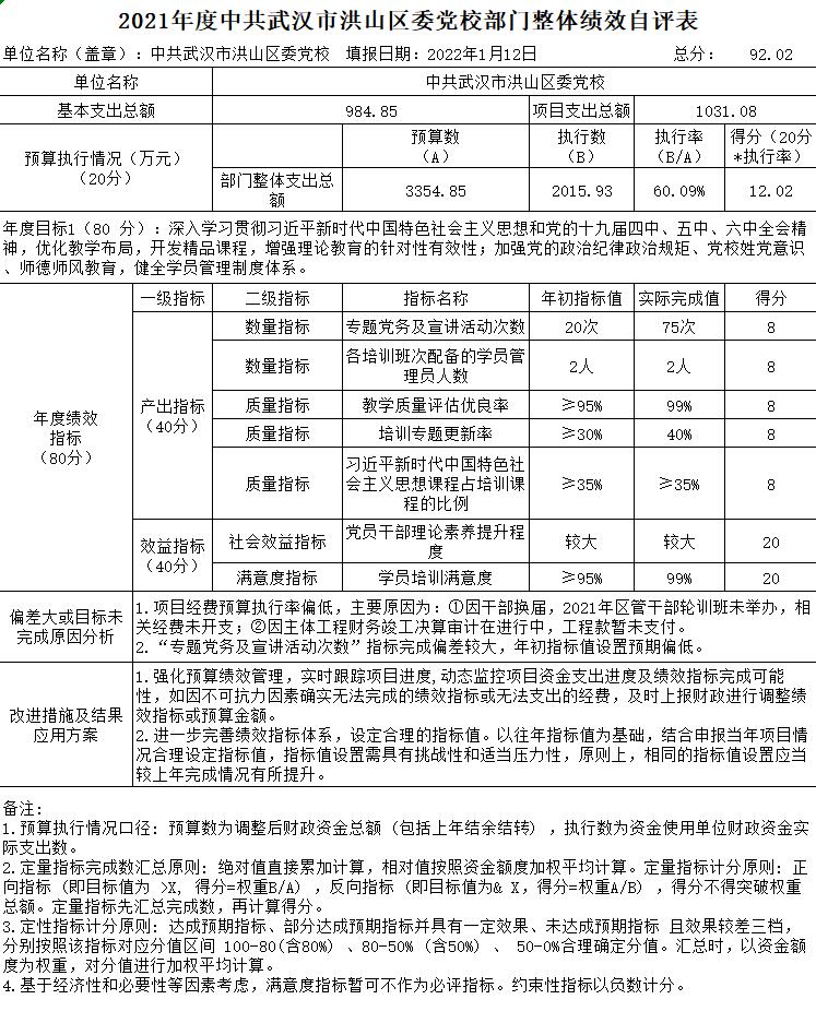 我部门组织对1个部门开展整体支出绩效自评,资金2015.93万元,评价情况来看,2021年,我校坚持以习近平新时代中国特色社会主义思想为指导,深入学习领会党的十九大、十九届二中、三中、四中、五中、六中全会以及“七一”重要讲话精神,坚决贯彻“党校姓党”根本原则,扎实推进党史学习教育,增强政治定力,切实履职尽责,加强自身修养,制定教学计划,更新教学内容,做好区管干部进修班、干部教育选学大课堂、专题研讨班等培训工作,提升区内党员干部政治素养,同时,我校积极完善校园建设,完备教学设施,为更好地履行教学培训职能提供保障,圆满完成年初目标。