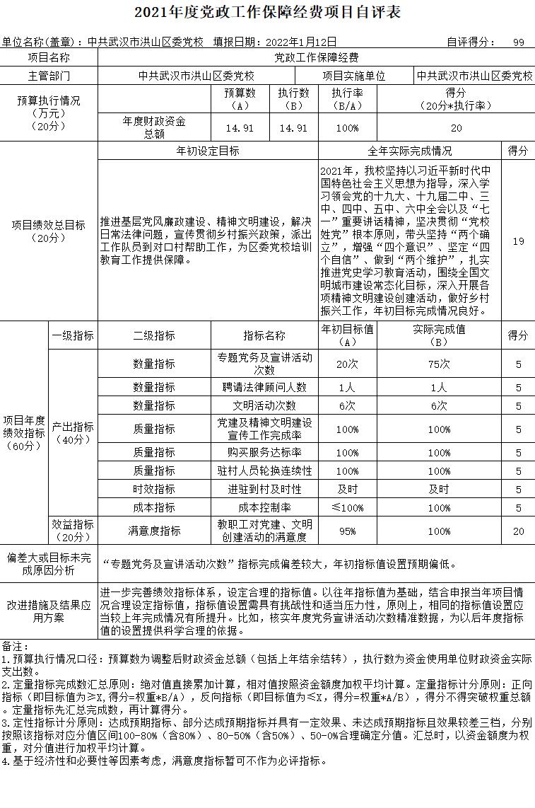 1.党政工作保障经费项目绩效自评综述:项目全年预算数为14.91万元,执行数为14.91万元,完成预算的100%。主要产出和效益是:一是2021我校通过深入学习,引导党员干部增强“四个意识”、坚定“四个自信”,做到“两个维护”,做好“三个表率”,提高了全体党员的思想认识;二是在区委、区政府的领导下,围绕全国文明城市建设常态化目标,深入开展各项精神文明建设创建活动。