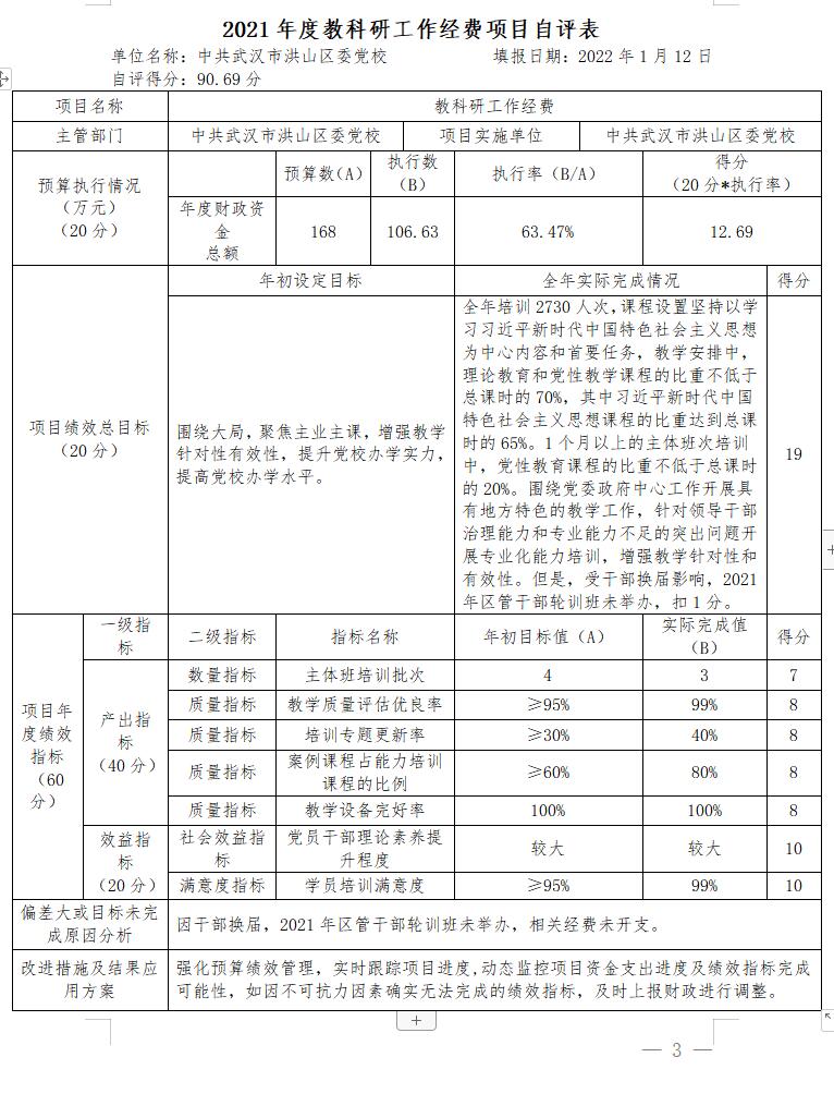 2.教科研工作经费项目绩效自评综述:项目全年预算数为168万元,执行数为106.63万元,完成预算的63.47%。主要产出和效益是:2021年我校在区委的正确领导下,认真学习贯彻习近平新时代中国特色社会主义思想及六中全会精神,增强政治定力,切实履职尽责,加强自身修养,制定教学计划,更新教学内容,提供优质教学,注重提升案例课程和习近平新时代中国特色社会主义思想课程在培训课程中的占比,做好区管干部进修班、干部教育选学大课堂、专题研讨班等培训工作,提升了区内党员干部政治素养,学员培训满意度达到100%,同时积极开展教学研究,推出一批优秀研究成果,较好地完成了年初绩效目标。存在的问题和原因:“主体班培训批次”目标值为4次,实际完成3次,本年度未完成该项指标任务。因干部换届,2021年区管干部轮训班未举办及教师进修培训、科研调研等工作疫情原因未开展,相关经费未开支,预算执行率偏低。