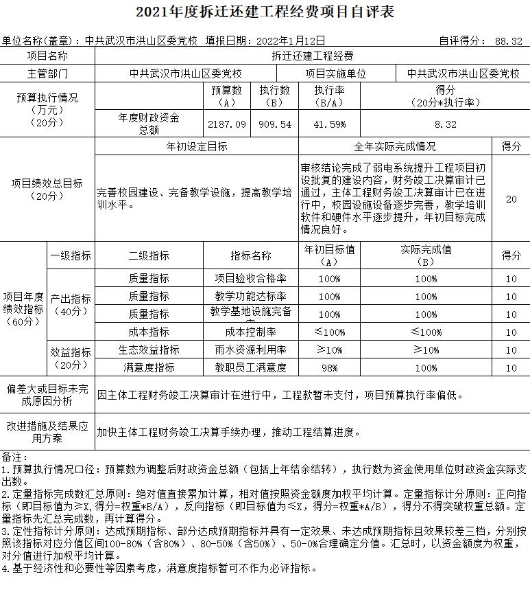 3.党校拆迁还建工程经费项目绩效自评综述:项目全年预算数为2187.09万元,执行数为909.54万元,完成预算的41.59%。主要产出和效益是:2021年,我校积极开展新校建设、雨水回收利用及弱电系统提升工程建设,审核结论完成了弱电系统提升工程项目初设批复的建设内容,财务竣工决算审计已通过,验收合格率100%,主体工程财务竣工决算审计已在进行中,校园设施设备逐步完善,提升了多媒体教学装备和信息化装备水平,为区委党校更好地行使教育培训职能提供了保障,年初绩效目标完成情况良好。存在的问题和原因:预算执行率有待提升。因主体工程财务竣工结算审计在进行中,工程款暂未支付,导致该项目预算执行率偏低。