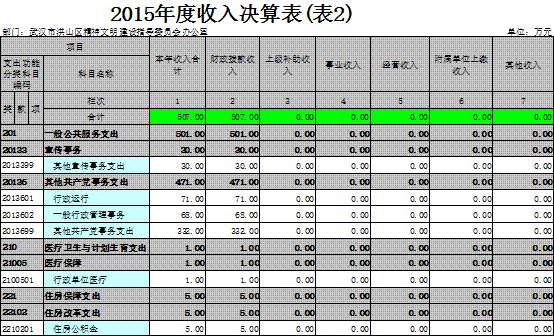 2015年度收入总计507万元,支出总计507万元。与2014年相比,收入减少180万元,降低26%。支出减少180万元,降低26%。主要原因是2014年武汉市争创全国文明城市,因此经费支出比较多。
