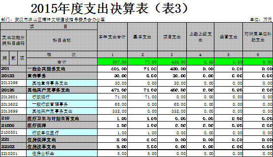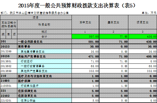 2015年一般公共预算财政拨款支出年度预算为507万元(包括年初部门预算、基本建设等专项资金、上级下达的专项转移支付资金及年初结转和结余资金等支出),支出决算为507万元,完成年度预算的100.00%。其中:基本支出77万元,项目支出430万元。项目支出主要用于宣传事务30万元,主要成效宣传辖区内的精神文明建设;项目名称一般行政管理事务68万元,主要成效办公室管理费用、聘用人员工资发放、文明城市督导专班建设等;项目名称其他共产党事务支出332万元,主要成效“洪山好人”评选、“道德讲堂”的开展与维护等。