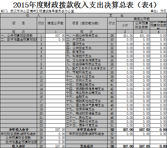 2015年度财政拨款(含政府性基金拨款)收支总计507万元。与2014年相比,财政拨款收、支总计各减少180万元,降低26%。主要原因是2014年武汉市争创全国文明城市,因此经费支出比较多。