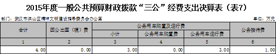 (2)公务用车运行维护费3万元,完成预算的74%,比预算减少1.05万元,主要原因是武汉市已经创建成功全国文明城市,2015年是维护年。