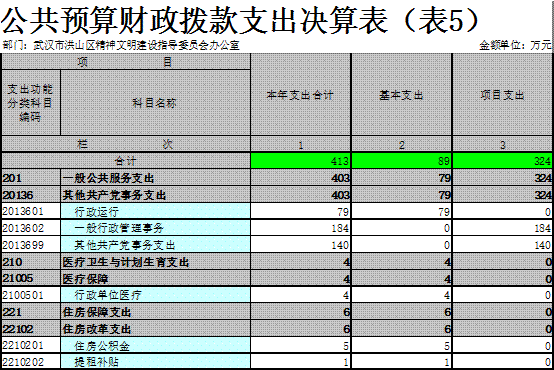 2016年一般公共预算财政拨款支出年度预算为499.81万元(包括年初部门预算、基本建设等专项资金、上级下达的专项转移支付资金及年初结转和结余资金等),支出决算为413万元,完成年度预算的82.63%。其中:基本支出89万元,项目支出324万元。项目支出一般行政管理事务184万元,主要成效办公室管理费用、聘用人员工资发放、文明城市督导专班建设等;其他共产党事务支出140万元,主要成效“洪山好人”评选、“道德讲堂”的开展与维护等。