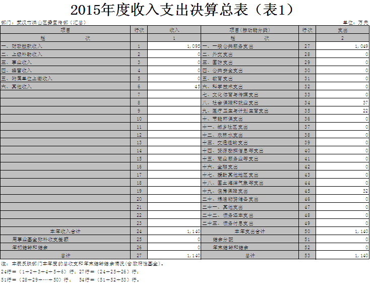 2015年度收入总计1,140万元,支出总计1,140万元。与2014年相比,收入增加250万元,增长28%,支出增加191万元,增长20%,主要原因是工资福利支出的增加及新闻宣传中心纳入区委宣传部核算。