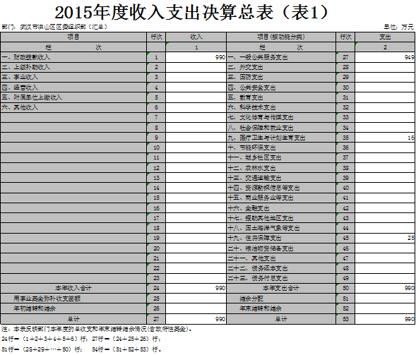 2015年度收入总计990万元,支出总计990万元。与2014年相比,收入增加199,增长25.16%,主要原因基本支出预算增加103万元,项目经费增加96万元。支出增加199,增长25.16%,主要原因是基本支出增加103万元,项目支出增加96万元。