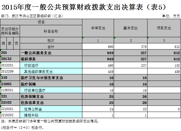 2015年一般公共预算财政拨款支出年度预算为990万元(包括年初部门预算、基本建设等专项资金、上级下达的专项转移支付资金及年初结转和结余资金等支出),支出决算为990万元,完成年度预算的100.00%。其中:基本支出378万元,项目支出612万元。