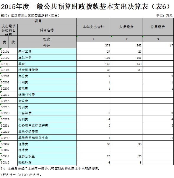 2015度一般公共预算财政拨款基本支出378万元,其中,人员经费361万元,主要包括:基本工资、津贴补贴、奖金、社会保障缴费、退休费、医疗费、住房公积金、提租补贴;公用经费17万元,主要包括:印刷费、邮电费、维修(护)费、会议费、培训费、工会经费、福利费、公务用车运行维护费和其他商品和服务支出。