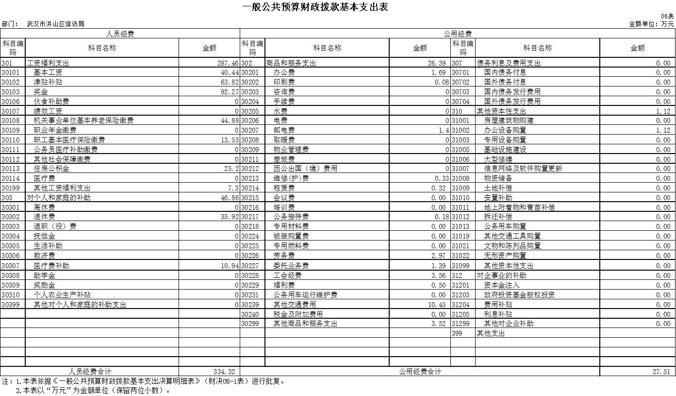 2018度一般公共预算财政拨款基本支出361.83万元,其中,人员经费334.32万元,主要包括:基本工资、津贴补贴、奖金、伙食补助费、绩效工资、机关事业单位基本养老保险缴费、职业年金缴费、职工基本医疗保险缴费、公务员医疗补助缴费、其他社会保障缴费、住房公积金、医疗费、其他工资福利支出、离休费、退休费、退职(役)费、抚恤金、生活补助、救济费、医疗费、助学金、奖励金、个人农业生产补贴、其他对个人和家庭的补助支出;公用经费27.51万元,主要包括:办公费、印刷费、咨询费、手续费、水费、电费、邮电费、取暖费、物业管理费、差旅费、因公出国(境)费、维修(护)费、 租赁费、会议费、培训费、公务接待费、专用材料费、被装购置费、专用燃料费、劳务费、委托业务费、工会经费、福利费、公务用车运行维护费、其他交通费用、 税金及附加费用、其他商品和服务支出、办公设备购置、专用设备购置、信息网络及软件购置更新、公务用车购置、其他交通工具购置、其他资本性支出、企业费用补贴、其他对企事业单位的补贴。