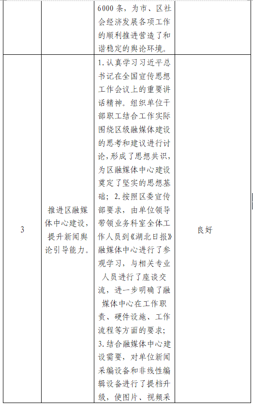 全年共监测、研判、处置涉及我区的各类负面舆情信息5000余条,下达舆情处置单36份,向市委宣传部直接上报涉武汉市社会舆情信息200余条,全年未发生一起重大敏感舆情。本中心3名网评员共计发表评论近6000条,为市、区社会经济发展各项工作的顺利推进营造了和谐稳定的舆论环境。