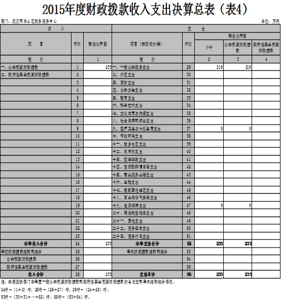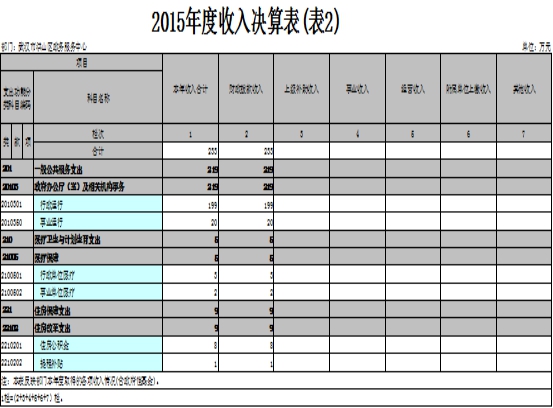 2015年度收入总计233万元,支出总计233万元。与2014年相比,收入减少97万元,支出减少97万元。